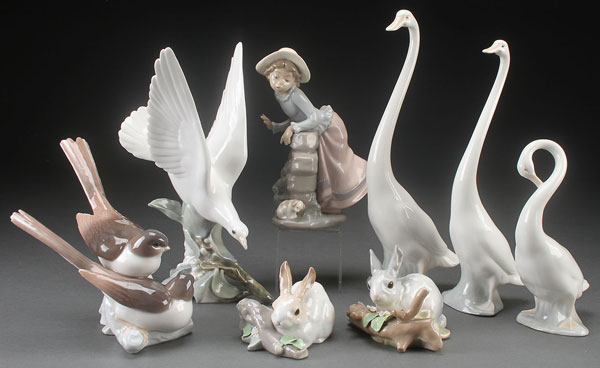 SEVEN LLADRO PORCELAIN ANIMAL FIGURES, LAST HALF 20TH CENTURY. Comprising of dove, various geese, lovebirds, and rabbits together with a Nao figure of a young girl. The largest 11.25 inches (28.58 cm).