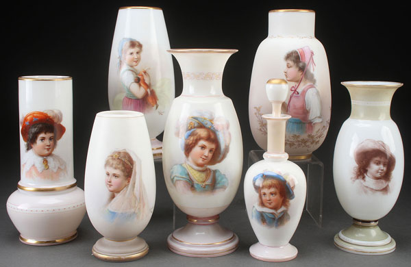 A FINE COLLECTION OF SIX JOSEF AHNE PORTRAIT VASES, LATE 19TH CENTURY. Each finely painted with a portrait of a young girl on white opal glass with gilt and stained trim work, the versos with various floral medallions or birds, and one with Paris Exhibition medals together with an Ahne portrait dresser bottle (repaired). Three of the vases signed "Ahne." The largest 10.5 inches (26.5 cm).