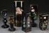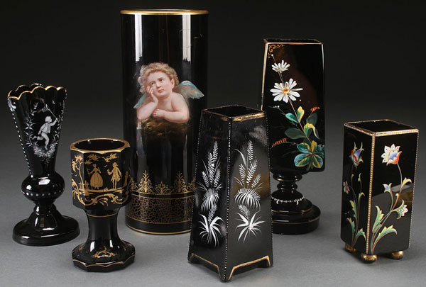 SIX NORTHERN BOHEMIA ENAMELED BLACK HYACINTH VASES, LATE 19TH CENTURY. Probably by Harrach, including a large cylindrical vase, with Raphael like Cherub. The largest 12.7 inches (32.5 cm).