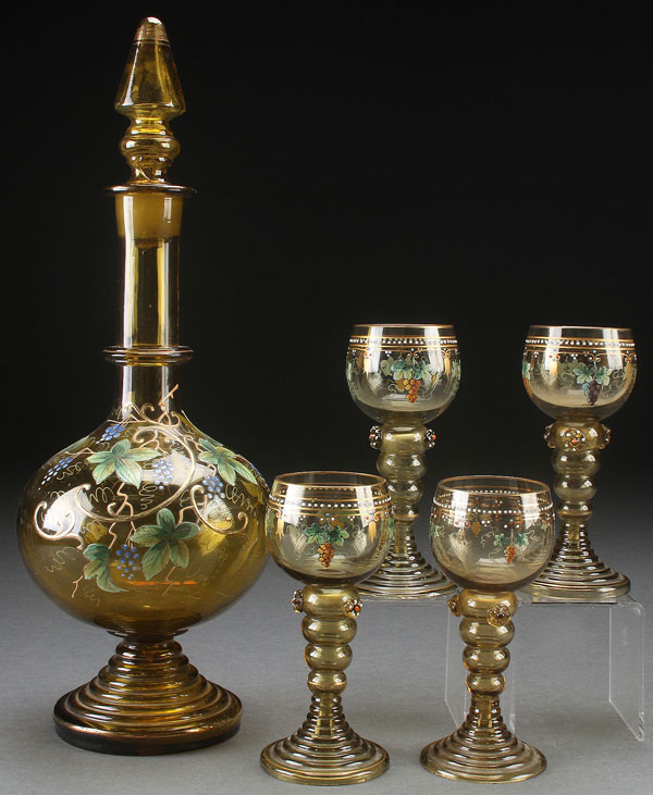 A VERY FINE NOVY BOR FIVE PIECE ENAMELED GLASS WINE SET, CIRCA 1885. Comprising an enameled decanter in olive colored glass with grape and vine motif with four associated enameled rohmers with applied prunts.