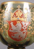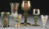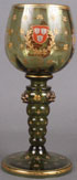 A SIX PIECE LOBEMEYER AND NOVY BOR ENAMELED BOHEMIAN GLASS GROUP, LATE 19TH CENTURY. Comprising a Lobemeyer wine with enameled river scene titled "Lorelei," a Lobemeyer enameled tumbler with scene of a drummer dressed in 16th century costume, a very fine armorial enameled rohmer with "Bohmen" inscribed enameled scroll, an etched and enameled cordial of young lovers possibly by Lobemeyer, a panel cut tumbler with enameled wild boar hunt, and a panel cut tumbler with enameled romantic pastoral scene. The largest 8.75 inches (22.25 cm).