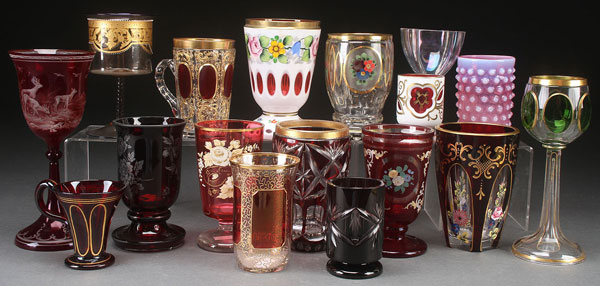 SEVENTEEN PIECE GROUP OF BOHEMIAN ENAMELED AND CUT GLASS TUMBLERS AND GOBLETS, 19TH/20TH CENTURY. Of various form and shape including cut panel overlay, ruby flashed, and floral enameled. The largest 8.5 inches (21 cm).