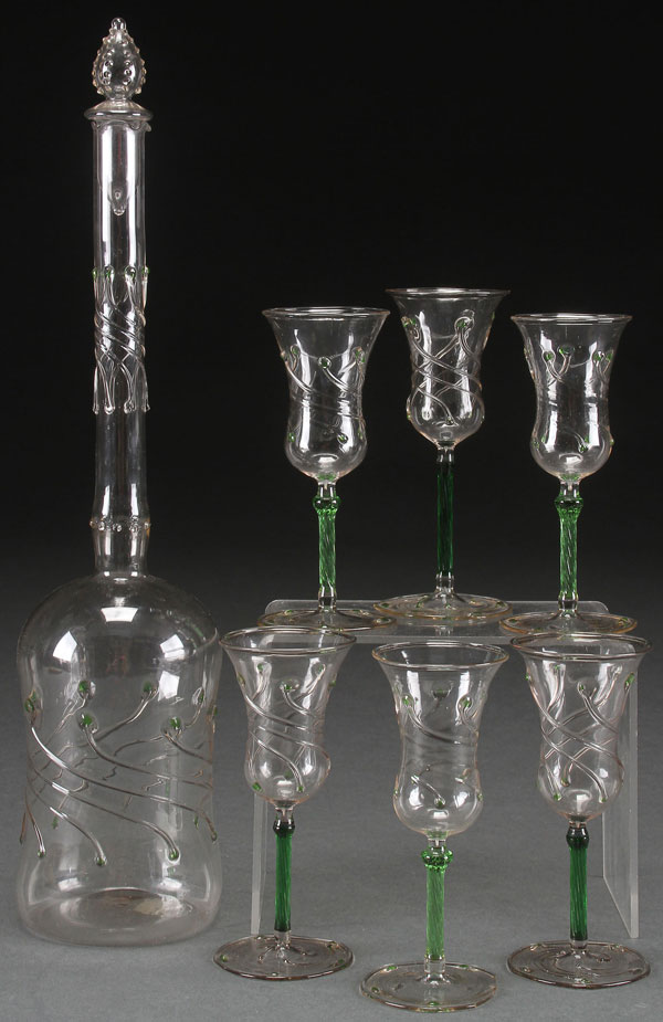 A SEVEN PIECE MEYERS NEFF APPLIED ART GLASS DECANTER SET, CIRCA 1900. Comprising an eggshell blown glass decanter with applied green prunts and crystal trailings, with six matching cordials of elongated inverted bell form with similar applied trailings raised on twisted rib emerald glass stems. Some loss to foot of one cordial. Height of decanter 12.5 inches (32 cm), cordials 4.375 inches (11 cm).