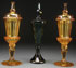 THREE BOHEMIAN PANEL CUT CRYSTAL LIDDED POKALS, 19TH/20TH CENTURY. Comprising a matching pair in citron colored glass raised on baluster stems with starcut scalloped spreading foot and surmounted with domed panel cut covers with a faceted finial, and a tourmaline green covered pokal etched with a romantic couple in 17th century style dress. Height 15 inches (38 cm).