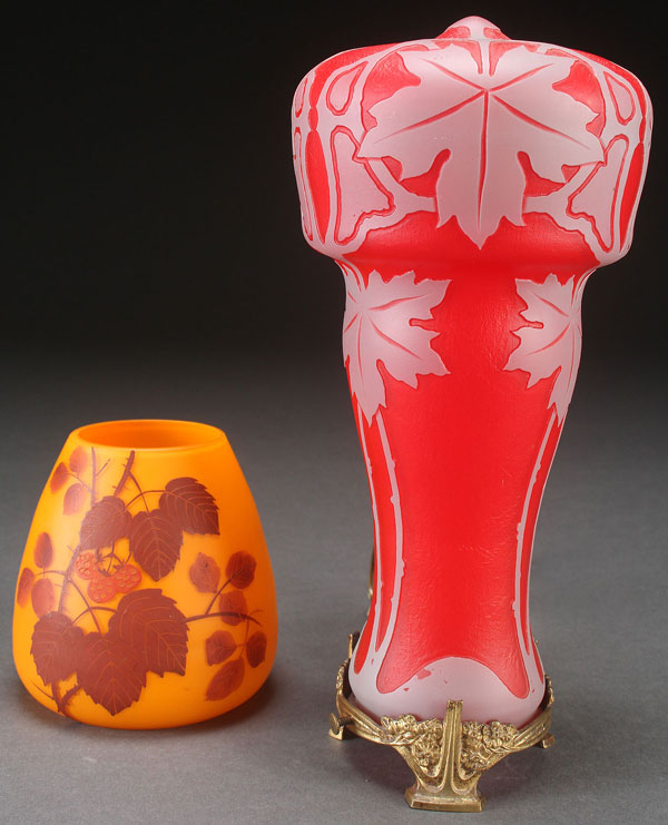 CZECH RIEDEL CAMEO GLASS DRESSER LAMP IN THE "SKELETON" PATTERN, EARLY 20TH CENTURY. The bronze footed lamp in red glass cut with a stylized grape leaf design, together with orange and amethyst overlaid vase cut with blackberries and leaves (Stamped oval Czech mark), the lamp apparently unsigned. Height 4.5 inches and 11 inches (11.5 and 28 cm)