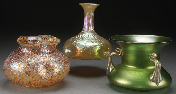 ATTRIBUTED TO LOETZ, THREE BOHEMIAN ART GLASS VASES, EARLY 20TH CENTURY. In green iridized glass with three applied handles, a crackle finish vase with scalloped rim, and a squat pinched form bottle, all with ground pontils. The largest 6.75 inches (17 cm)