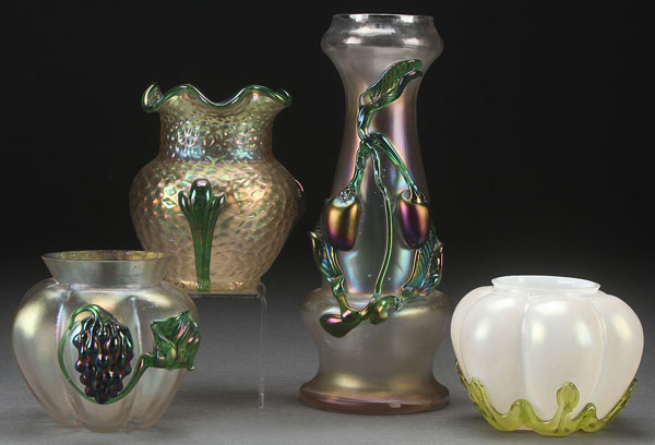 FOUR KRALIK BOHEMIAN ART GLASS VASES, EARLY 20TH CENTURY. In iridized glass with applied decoration including leaves and fruit. The largest 10.5 inches (27 cm).