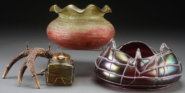 A THREE PIECE BOHEMIAN ART GLASS GROUP, EARLY 20TH CENTURY Comprising of a Pallme-Konig faux stag antler pen rest with iridized and threaded inkwell, a Pallme-Konig threaded three handled low bowl and a green and maroon threaded glass bowl with ruffled rim. The largest diameter 8.5 inches (21.59 cm).