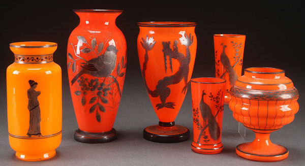 SIX CZECH ART DECO SILVER DEPOSIT DECORATED VASES, CIRCA 1930. Of various form and motif, including an oriental dragon and neoclassic woman, 10.75 inches (27.3 cm).