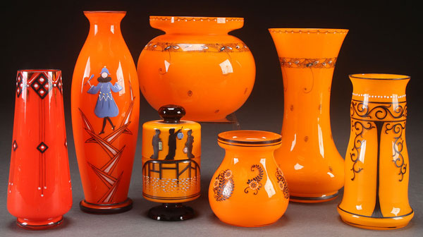SEVEN CZECH ENAMELED ART GLASS VASES, CIRCA 1930'S. Of various form and design, including a covered cigarette jar with geishas in silhouette. The largest in height 8.5 inches (21.5 cm).