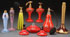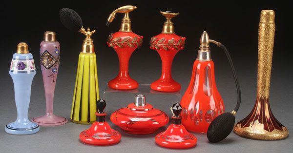 TEN CZECH ENAMELED ART GLASS PERFUME BOTTLES, CIRCA 1930'S. Including cut panel enameled a two piece gilt mounted set with filigree leaves, and glass berries, and a cranberry gold-etched atomizer base signed "De Villebus." The largest 8 inches (20.5 cm).