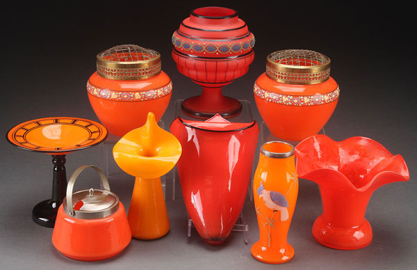 NINE PIECE GROUP OF CZECH ART DECO AND ENAMELD ART GLASS, EARLY 20TH CENTURY. Comprising a wall pocket with black lip wrap, two matching rose bowls, a black stemmed compote, jack vase, a Coralene decorated vase with sterling rim, and other items. The largest 8.5 inches high (21.59 cm).