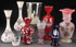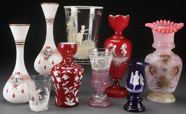 NINE BOHEMIAN ENAMELED MOSTLY VICTORIAN GLASS VASES, 19TH/20TH CENTURY. Comprising a matching pair in white satin with scenic graisille medallions and red oxide designs, a cranberry cased Mary Gregory style vase, a Mary Gregory style cylindrical vase, a shaded pink gilt enameled mantel vase, and other items. The largest 12 inches (30.5 cm).