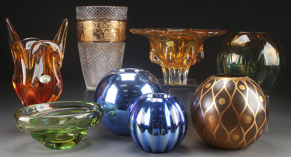 EIGTH CZECH AND BOHEMIAN GLASS VASES AND BOWLS, 20TH CENTURY. Including a late Moser diamond point cut vase with etched gilt Trojan warrior panel, three shaded amber free-form bowls, a large green and amber leaf rib pattern rose bowl, and two blue mercury glass rose bowls. The largest 10 inches (25.5 cm).