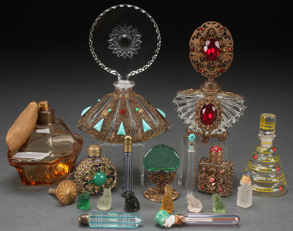 EIGHT CZECH PERFUME BOTTLES, EARLY 20TH CENTURY. Of various form including a ruby jeweled and gilt filigree, a cut glass gilt filigree and turquoise mounted vase with large rosette form cut stopper, several Nailsea type including a painted porcelain stopper with bust of a flapper girl together with six miniature satin glass animal figures. The largest 6.25 inches (15.5 cm).