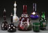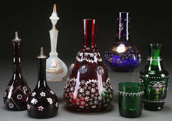 SIX PIECE GROUP, CZECH ENAMELED GLASSWARE, 19TH/20TH CENTURY Comprising an opalescent ribbed and enameled scenic dresser bottle, two enameled barber's bottles, a green enameled tumble-up, a ruby flashed and enameled bottle with clear applied prunts, and a white floral enameled cobalt bottle form vase. The largest 11 inches (28 cm).