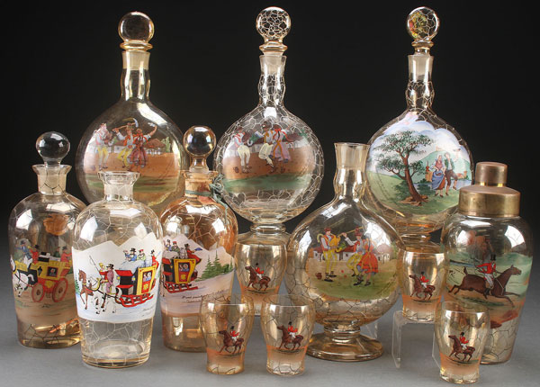 THIRTEEN PIECE GROUP OF CZECH ENAMELED CRACKLE STYLE GLASS DECANTERS AND FIVE TUMBLERS, EARLY TO MID 20TH CENTURY. Comprising four flattened ovoid liqueur bottles enameled with festive dance scenes, three round decanters enameled with coach scenes, and a six piece shaker set with enameled fox hunt scene. The largest 12 inches.