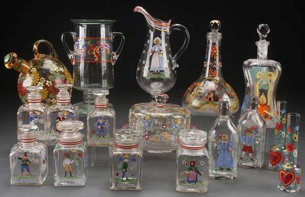 A 16 PIECE GROUP OF CZECH ENAMELED GLASS APOTHYCARY JARS, BOTTLES, AND TABLEWARE, 20TH CENTURY. Mostly in crystal with colorfully enameled floral and festive designs. The largest 10.5 inches (26.5 cm).