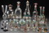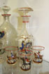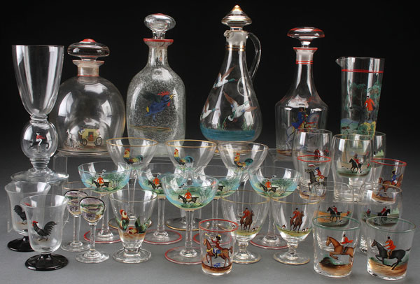 THIRTY-ONE PIECE GROUP OF CZECH ENAMELED ART GLASS STEMWARE AND DECANTERS WITH HUNT SCENES, MID 20TH CENTURY. Including decanters, cocktail pitcher, stems, tumblers, and a goblet with lamp work equestrian figure within hollow stem. The largest height 9.75 inches (24.7 cm).