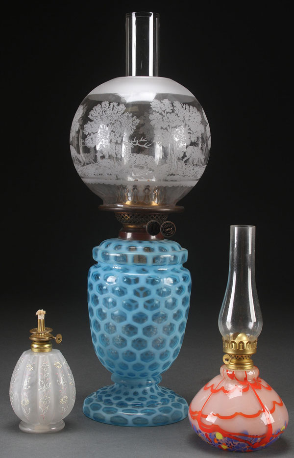 THREE CZECH KEROSENE LAMPS, 19TH/20TH CENTURY. Comprising a blue opalescent honeycomb pattern two section kerosene lamp with etched wildlife shade and duplex burner, a spatter glass Art Deco lamp, and an enameled lamp with Franz Wagner paper label. The largest 21.5 inches (54.5 cm).