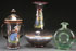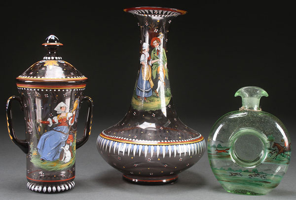 A CZECH ENAMELED GLASS GROUP, 20TH CENTURY. Comprising a large bulbous vase with festive dancing couple, a handled covered loving cup with enameled scene of a woman spinning yarn signed "Bohemian Peasant Ware," and a ring form pinch bottle sans stopper with painted fox hunt scene. The largest 14.5 inches (37 cm).