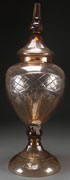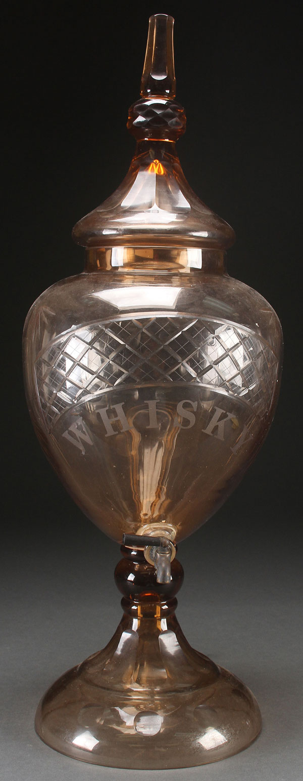 LARGE CZECH ETCHED AND CUT GLASS LIDDED WHISKEY DISPENSER, EARLY 20TH CENTURY. Of ovoid form cut with a lattice band, stars, and thumbprints, above an etched "Whiskey" raised on a cut panel and thumbprint bell form base, and surmounted by a panel cut lid with faceted terminal. Height 30.5 inches (77.5 cm).