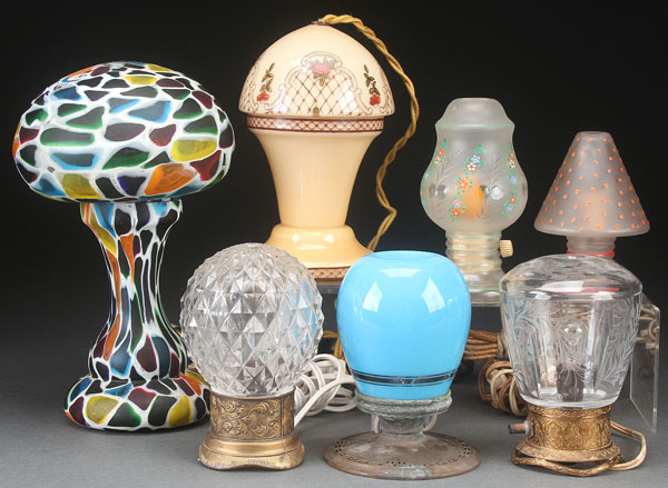 SIX CZECH AND BOHEMIAN GLASS DRESSER LAMPS, EARLY TO MID 20TH CENTURY. Including a large mushroom shape spatter glass lamp, a Novy Bor enameled lamp, two lamps with cut glass shades, and other varieties. Largest 9.625 inches.