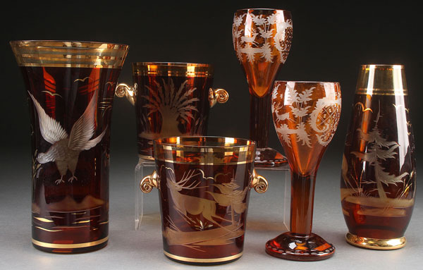 SIX CZECH EGERMANN STYLE AMBER FLASHED AND ETCHED GLASS PIECES, LAST HALF 20TH CENTURY. Comprising a flared vase with eagle, a tapering vase with stage, two gilt-handled ice tubs with wildlife scenes, and two matching footed goblets. The largest 11.75 inches.