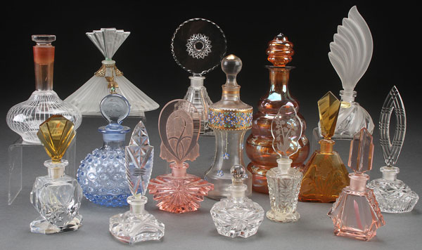 FIFTEEN PIECE GROUP OF CZECH ART DECO GLASS DRESSER AND PERFUME BOTTLES, EARLY TO MID 20TH CENTURY. Including satin glass, cut panel, cut glass, and floral enameled. The largest 8.5 inches.