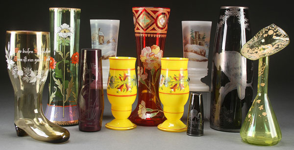 ELEVEN PIECE GROUP CZECH ENAMELED VASES, 19TH/20TH CENTURY. Including a large floral decorated cranberry glass vase, a large stylized floral green panel glass vase, a foliate enameled drinking boot with motto, an enameled jack vase, three black glass and silver decorated vases, and other items. The largest height 14.25 inches (36 cm).