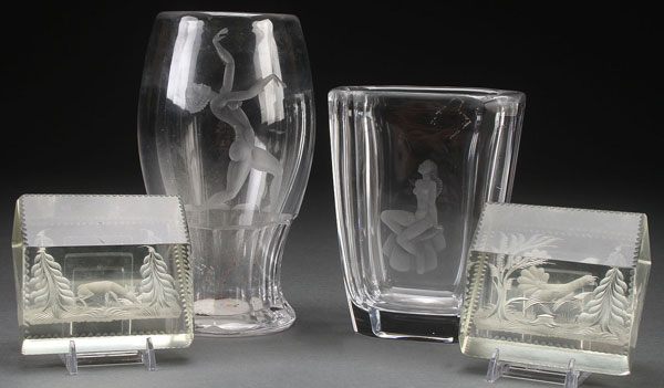 A PAIR OF SWEDISH ETCHED CRYSTAL VASES, EARLY TO MID 20TH CENTURY. With nude figures, the largest signed indistinguishably. The seated nude signed "Orrefors," together with a pair of Austrian or bohemian etched glass table prisms with scenic wildlife decoration. The largest 8.625 inches (21.5 cm).