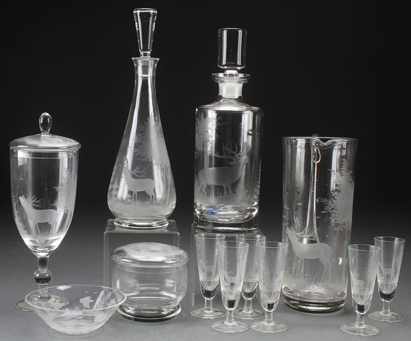TWELVE PIECE GROUP OF BOHEMIAN AND CZECH ETCHED GLASS DECANTERS AND STEMWARE, 20TH CENTURY. All with stag in forest scenes, comprising two decanters, a cocktail pitcher, covered pokal, six cordials, a lidded condiment jar, and waster bowl. The largest height 11.5 inches (29 cm).