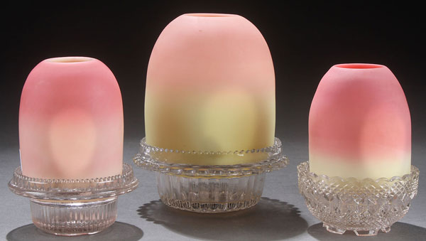 THREE WEBB BURMESE CLARKE’S FAIRY LAMPS, LATE 19TH CENTURY. Each with satin Burmese glass shades and clear embossed bases. The largest height 5 inches (12.5 cm).