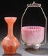 A VERY FINE VICTORIAN ART GLASS SWEETMEAT. In cranberry shaded satin glass with opalescent coin spot windows. In a silvered frame together with a salmon colored mother of pearl cabinet vase. The largest height 9 inches (23 cm).