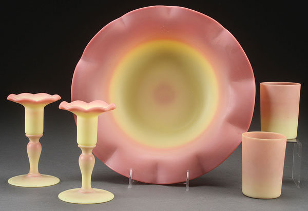A FIVE PIECE BURMESE ART GLASS GROUP. Comprising a 12-inch bowl, two candle sticks, and two tumblers. The largest diameter 12 inches (30.5 cm).