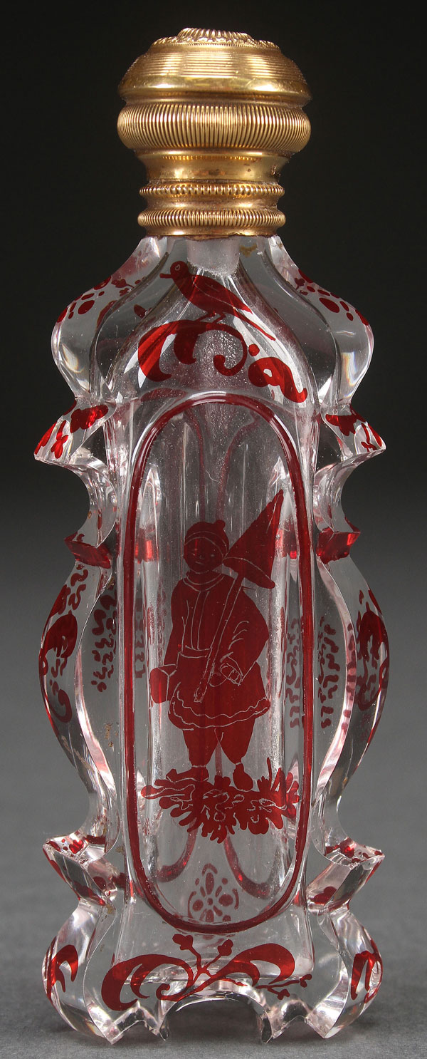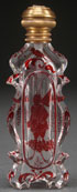 A VERY FINE CONTINENTAL 18K GOLD AND CUT GLASS LAY DOWN PERFUME BOTTLE, FIRST HALF 19TH CENTURY. decorated with Ruby Stained Foliates, indistinguishable hallmarks on lid. Length 4.75 inches (12 cm).