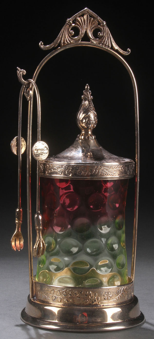 A VICTORIAN RUBINA INVERTED THUMBPRINT PICKLE CASTOR. Contained in a Rogers and Bros. silver-plate frame with matching lid and tongs. Height 10.25 inches (26 cm).