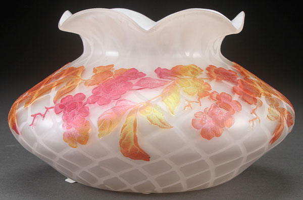 A MOTHER OF PEARL AND CAMEO ART GLASS LOW BOWL, LAST HALF 20TH CENTURY. In white opaque glass overlaid and cut with cherry blossoms. The base with a spurious etched “WEBB and SONS” mark. Diameter 8.5 inches (21.5 cm).