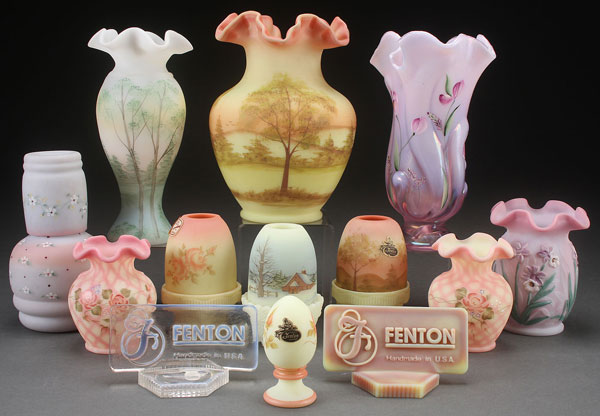 AN ELEVEN PIECE ARTIST DECORATED FENTON ART GLASS COLLECTION, 20TH CENTURY. Including Burmese and limited editions including vases, tumbleup, and fairy lamps. The largest 8.75 inches. Together with an opalescent and Burmese shelf plaques.
