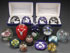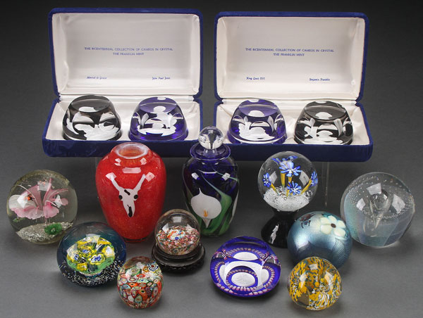 THIRTEEN ART GLASS PAPERWEIGHTS, INCLUDING FOUR CASED FRANKLIN MINT BICENTENNIAL CAMEOS. A St. Louis Statue of Liberty medallion and an ornate and flume together with an ornate and flume southwest motif vase, and a Peter Raos lily decorated bottle. Dated 1999. The largest 6 inches.