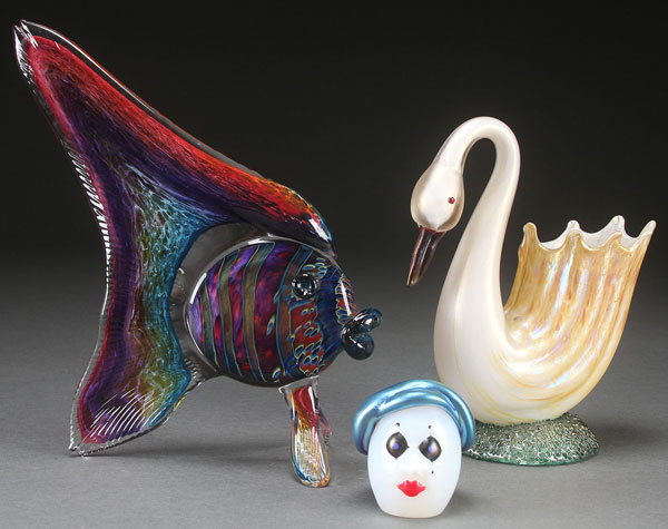A TOM BLOYD CONTEMPORARY ART GLASS SCULPTURE, LATE 20TH CENTURY. In the form of an exotic fish. Height 11.5 inches (29 cm). Together with a Czech art glass figural swan vase, and a Smallhouse and Co. art glass clown face paperweight signed and inscribed "2/87."