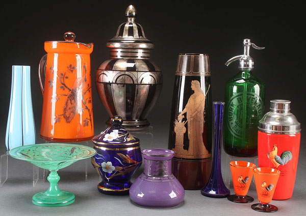 TWELVE PIECE GROUP CZECH ART DECO GLASSWARE, CIRCA 1930'S. Comprising a large black hyacinth glass vase with sepia decoration of a Greek woman, an Art Deco silver decorated black hyacinth lidded jar, a silver decorated orange and crystal case beverage pitcher, an enameled cocktail shaker with two matching tumblers, a silver decorated compote, a "Burk Beverages" seltzer bottle, and other items. The largest 12.75 inches (32 cm).