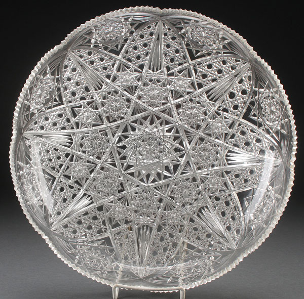 A LARGE LIBBEY CUT GLASS LOW BOWL. With button and daisy and hob star pattern below a soft tooth scalloped rim. Diameter 14.5 inches (37 cm).