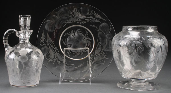 A LIBBEY AND HAWKES ENGRAVED AND CUT CRYSTAL GROUP, EARLY 20TH CENTURY. Comprising a 8.25-inch Libbey handled jug with thistles, 8-10 inch Libbey plate with floral pattern, and a 7-inch Libbey rose bowl.