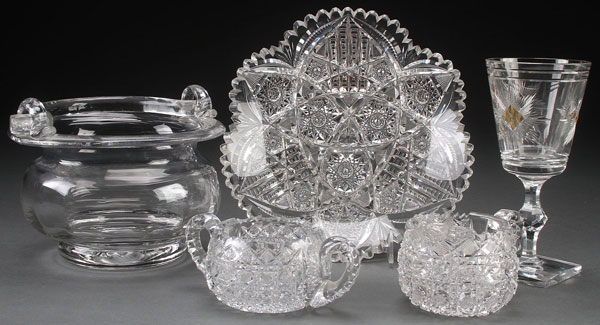 A FIVE PIECE CRYSTAL AND CUT GLASS GROUP, EARLY TO MID 20TH CENTURY. Comprising a Libbey 9.75-inch plate, a Hawkes star cut and amber flashed goblet, a creamer and sugar, and an unmarked crystal ice tube with bale handle.