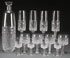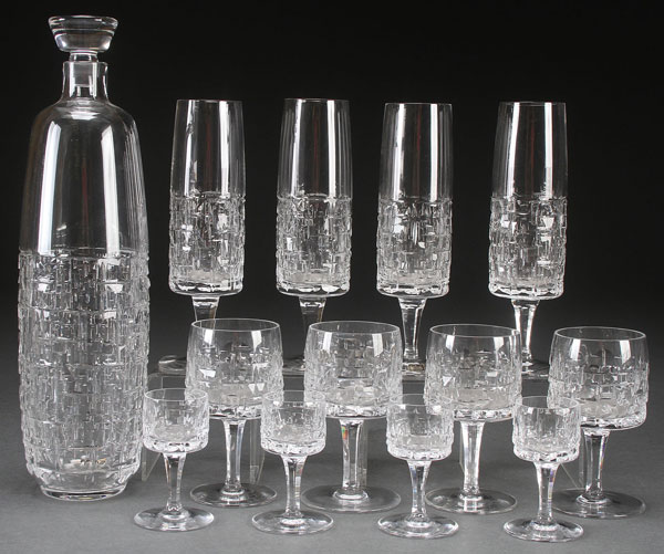 THIRTEEN PIECE SET OF BOHEMIAN CUT GLASS DECANTER AND MATCHING STEMS, MID 20TH CENTURY. Each with a matching modernist cut panel design. The largest 12.75 inches (32.5 cm).