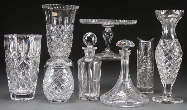 EIGHT PIECES OF CZECH CUT LEAD CRYSTAL, LAST HALF 20TH CENTURY. Including vases, decanters, and a cake stand. The largest 14.25 inches (36 cm).