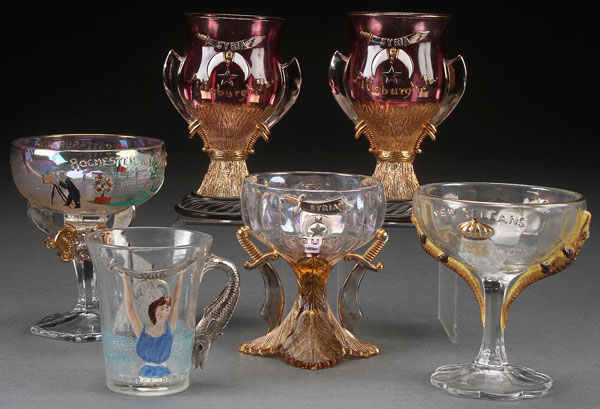 A SIX PIECE GROUP OF MOSAIC ENAMELED CONVENTION GLASS, EARLY 20TH CENTURY. Comprising two Saint Paul, MN 1908 ruby flashed goblets. A 1909, 1910, and 1911 sherbets, and a 1904 handled mug. Each embossed Syria and Pittsburg, PA. The largest 5.25 inches (13.2 cm).