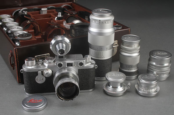 A VERY FINE LEICA MODEL IIIf RED DIAL CAMERA OUTFIT AND COMBINATION CASE, MID 20TH CENTURY. Serial #771022. With Leitz Elmar 50mm lens f3.5 screw mount lens, 35mm Summaron f3.5 screw mount lens, serial #974428; 90mm Elmar four screw mount lens, serial #1285010. 135mm Hektor f4.5 screw mount lens, serial #1346671. 50mm Summarit f1.5 screw mount lens, serial# 954589. Together with a sun shade for Summitar lens, adjustable sun shade for 50mm, 90mm, and 135mm lenses, clamping sun shade for 50mm and 90mm lenses, sun shade for 50mm Summar lens, rangefinder, right angle in cans, five clamp-on filters, four additional filter, view finder for 35mm lens, view finder for 90mm lens, view finder for 135mm lens, and two case keys.