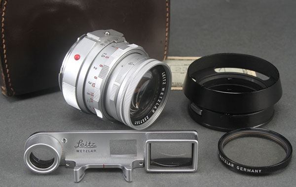 A VERY FINE LEITZ WETZLAR 50mm f2 DUAL RANGE SUMMICRON LENS, LAST HALF 20TH CENTURY. With model M bayonet mount. Second version close-up “eyes” attachment, reversible lens hood, UVa filter, and plastic lens cap. All contained in a fitted leather case.